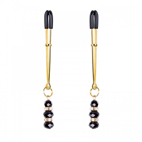 Estas pinzas para pezones de SENS con piedras de Onyx (fantasía) destacan por su silueta alargada y una estética elegante y sofisticada. El cuerpo metálico en tono dorado sostiene con delicadeza tres cuentas negras facetadas, acompañadas por circones que aportan brillo y generan un juego visual de peso y movimiento. Las pinzas, recubiertas con silicona y complementadas por un anillo regulador de intensidad, transforman la estimulación en una experiencia tan visualmente impactante como sensorial