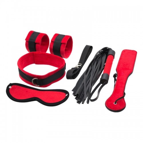 Incluye: esposas con cadena, collar con correa, látigo, palmeta y antifaz