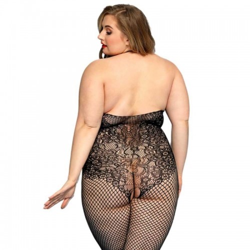 Este enterito de malla negro combina red fina y encaje floral en un diseño que envuelve el cuerpo con efecto visual irresistible. El escote con tiras decorativas dirige la mirada y realza el busto con sutileza. La mezcla de tramas estiliza la silueta y aporta contraste. Su tejido elasticado se adapta cómodamente resaltando cada curva.