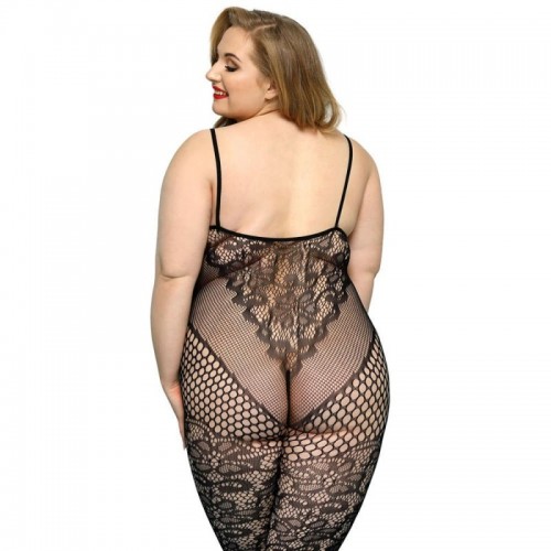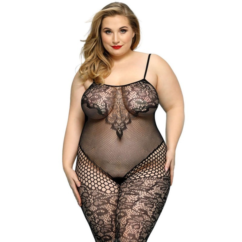 Este enterito negro fusiona encaje y malla en un diseño que celebra las curvas con elegancia y carácter. El detalle floral central dirige la mirada hacia el escote, mientras la textura en contraste estiliza el abdomen y las piernas. Su ajuste elástico abraza el cuerpo creando una silueta firme, sensual y sofisticada.